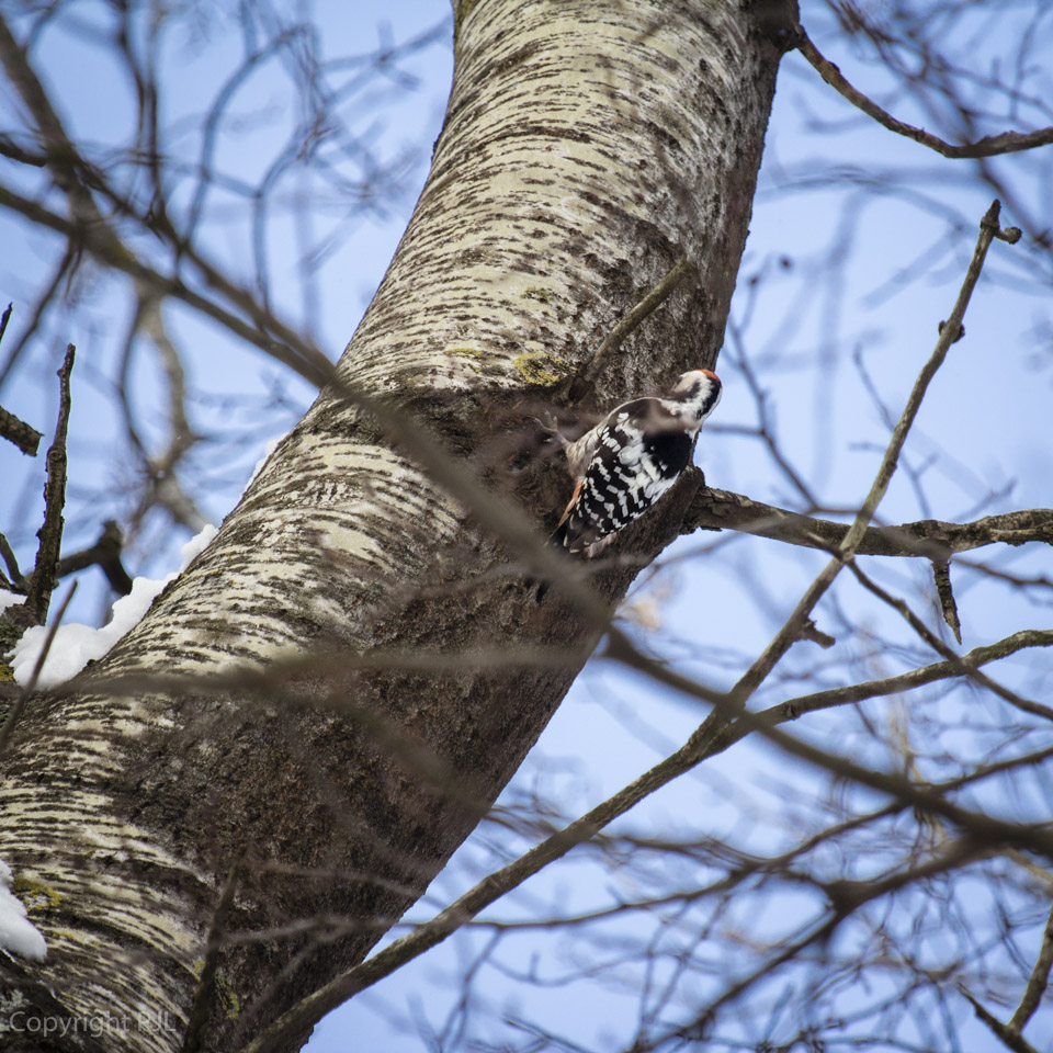 Mätäjoen varrella kannattaa ulkoilla ja katse suunnata myös ylös. Rantalehdoissa voi nähdä jäniksen, kauriin ja hiukan korkeammalla jopa harvinaisen valkoselkätikan kuten alla olevassa kuvassa. Joella on nähty myös erittäin harvinainen kuningaskalastaja. Koskikarakin on virtapaikoissa usein nähty talvivieras.