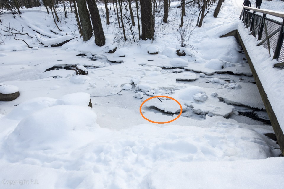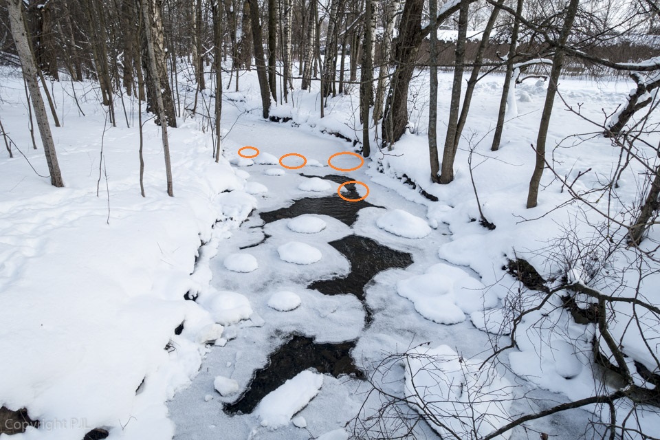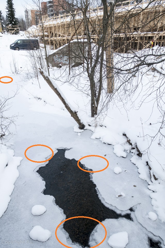 Helmikuun alkupuolella Etelä-Suomi oli pakkasen kourissa. Pekan käydessä 9.2. Mätäjoella, pakkasta oli toistakymmentä astetta. Pitäjänmäentien vieressä on useita taimenten kutupesiä, jotka on ympyröity yllä olevaan kuvaan. Osa kutupesistä on jääkannen alla. Osa on osittain tai lähes kokonaan sulassa vedessä. Jääkansi on hyvä asia. Jään alle, joen pohjaan ei pääse kovillakaan pakkasilla muodostumaan ns. suppojäätä. Suppo voi kutupesään kasvaessaan jäädyttää mädin tai estää veden virtauksen. Kummallakin on mädille tuhoisat seuraukset. Suppoa ei onneksi näkynyt.