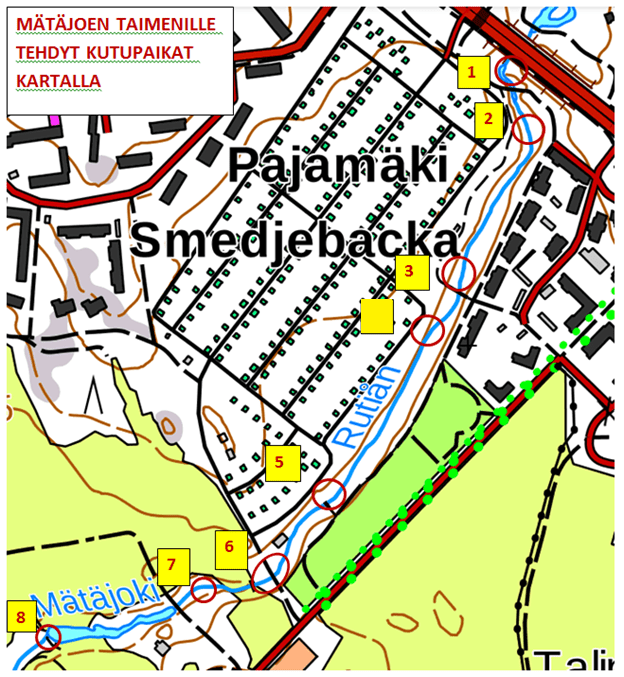 Erittäin uhanalaiset taimenet alkavat kerääntyä kutupaikoille lokakuun alkupuolella, viime vuonna ensimmäiset jo 4.10. Lähiaikoina kannattaa siis suunnata askeleet kohti pääkaupunkiseudun puroja. Mätäjoen Talin alueella taimenilla on seitsemän sorapohjaista virtapaikkaa, joihin mätinsä laskea. Ne löytyvät alla olevasta kartasta