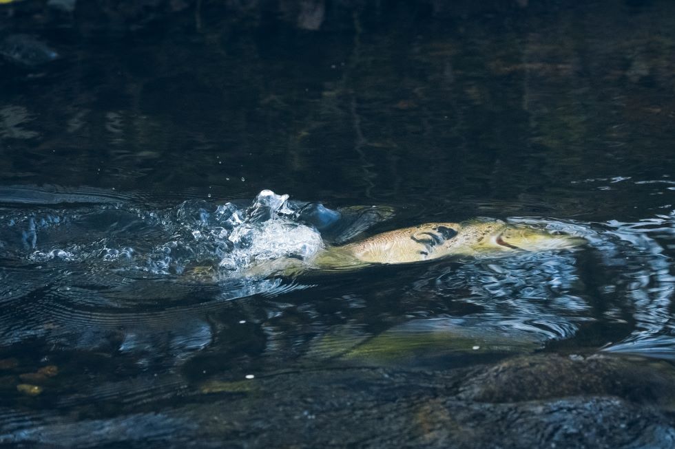 Alla mereltä palannut naarastaimen kaivaa marraskuussa 2024 kutupesää Mätäjoen pohjasoraan aivan vilkasliikenteisen Pitäjänmäentien vieressä.